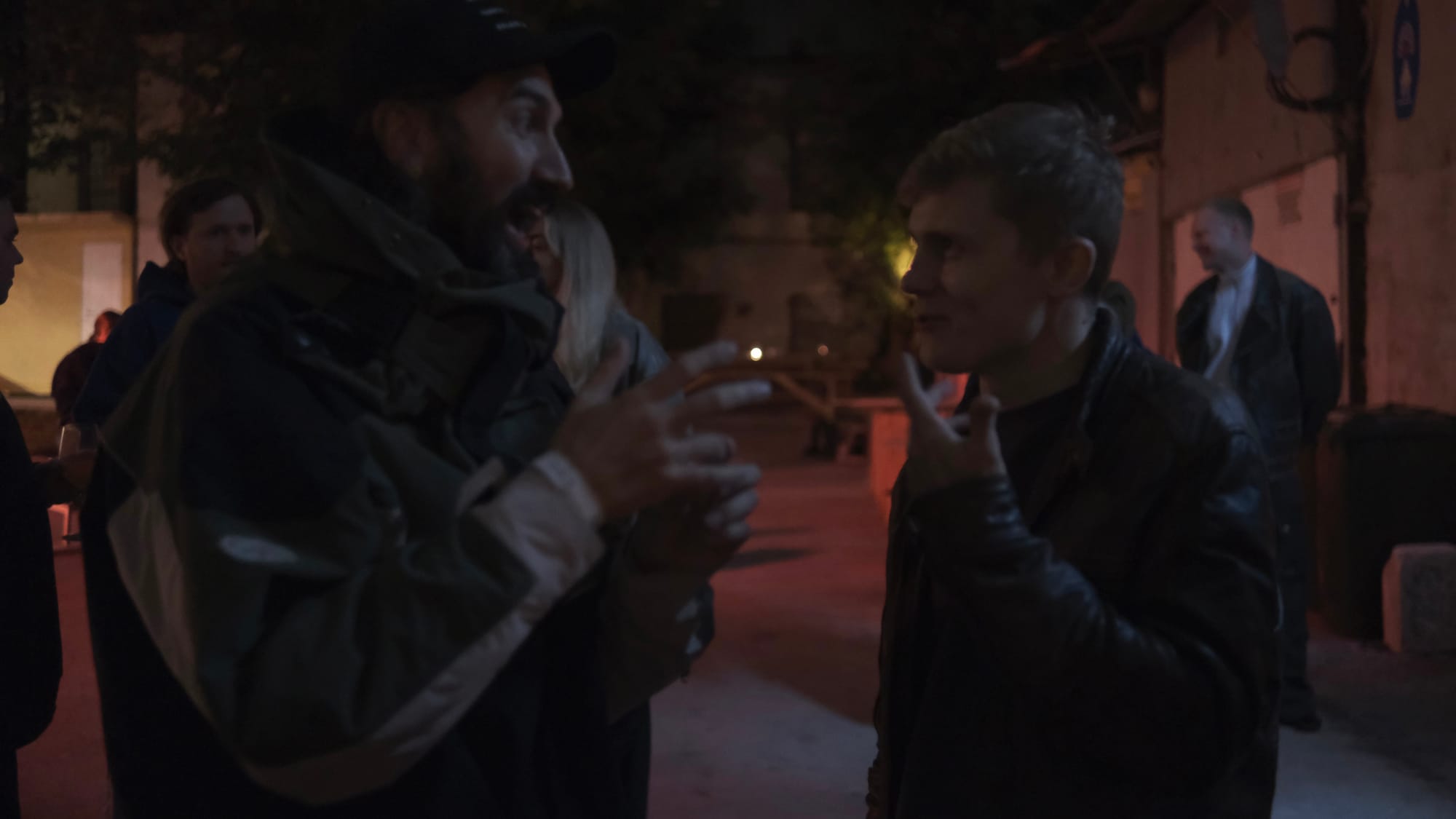 Пауза длиннее обычной. В этой паузе слышно, как кто-то передвигает бетонный блок. Как перестановка границы. Камера отъезжает чуть назад, оставляя двоих в центре кадра — маленький закрытый мир внутри большого. Толпа сзади снова оживает: разговор закончил свою службу, и можно вернуться к вину, сигаретам и словам, которые ничего не стоят.